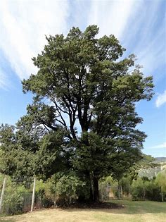 Attractive tree with black bark and deep green round leaves.