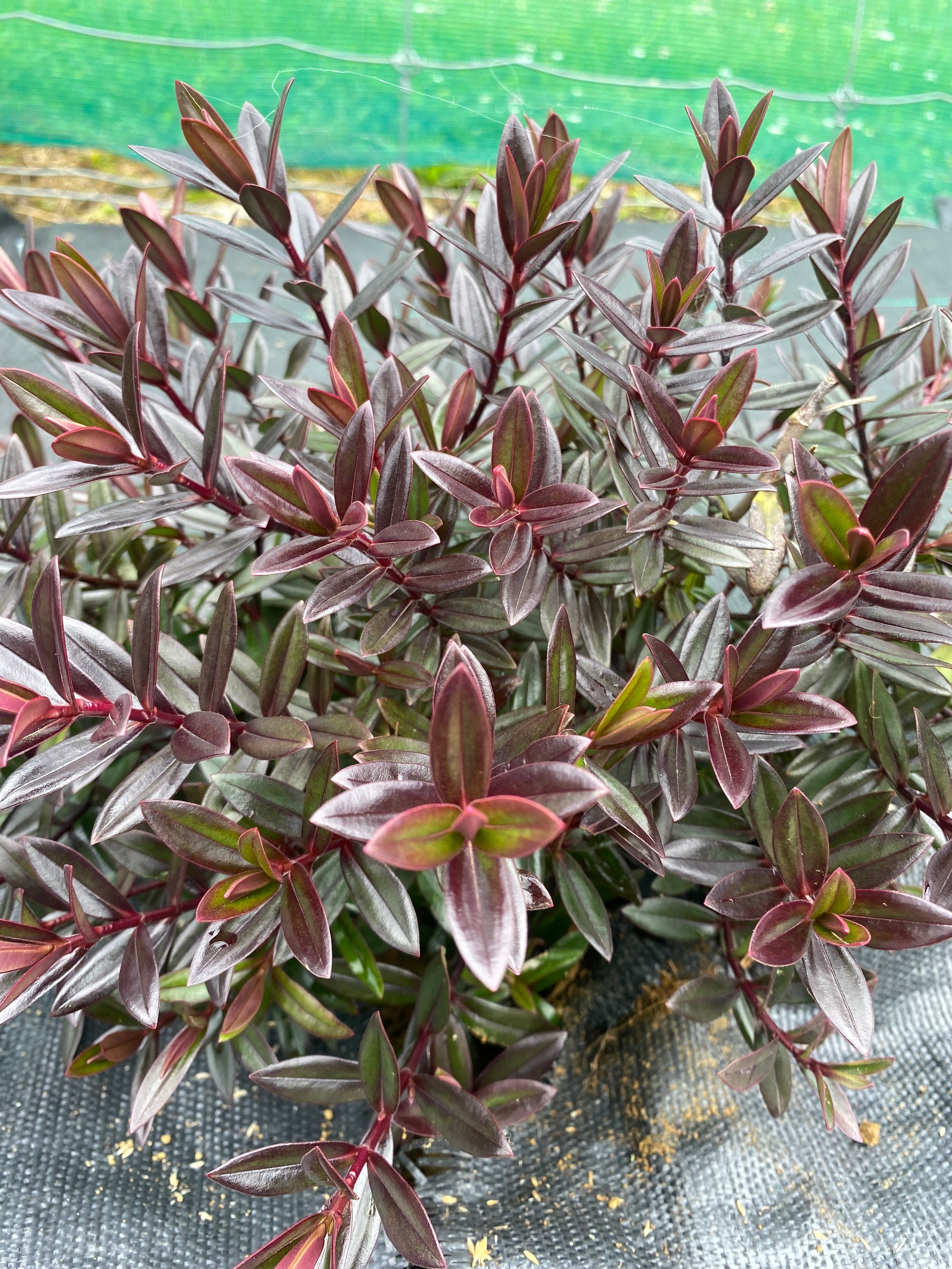 Hardy evergreen shrub with deep burgundy foliage all year round when in full sun.